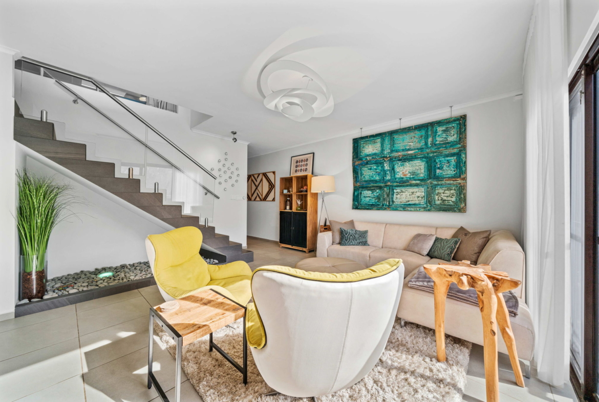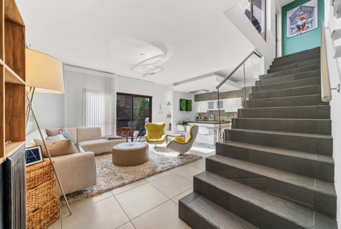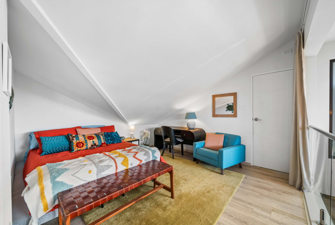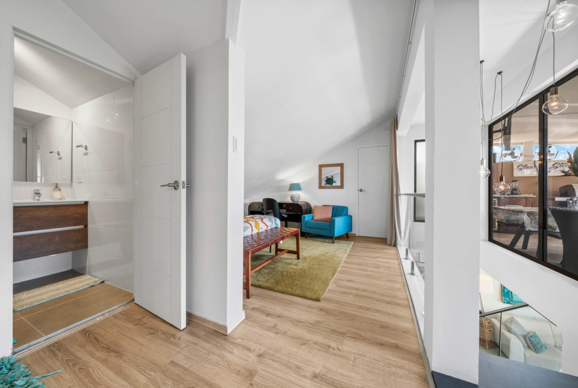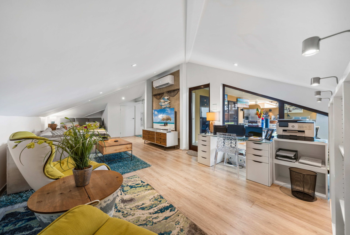 A striking glass-railed staircase leads to the upper level, where a spacious TV lounge and office area provide the perfect setting for relaxation or working from home. This level also offers a thoughtfully designed two-bedroom layout, a convenient storage and laundry area, and access to a covered terrace where you can unwind while enjoying refreshing ocean breezes and beautiful ocean views.