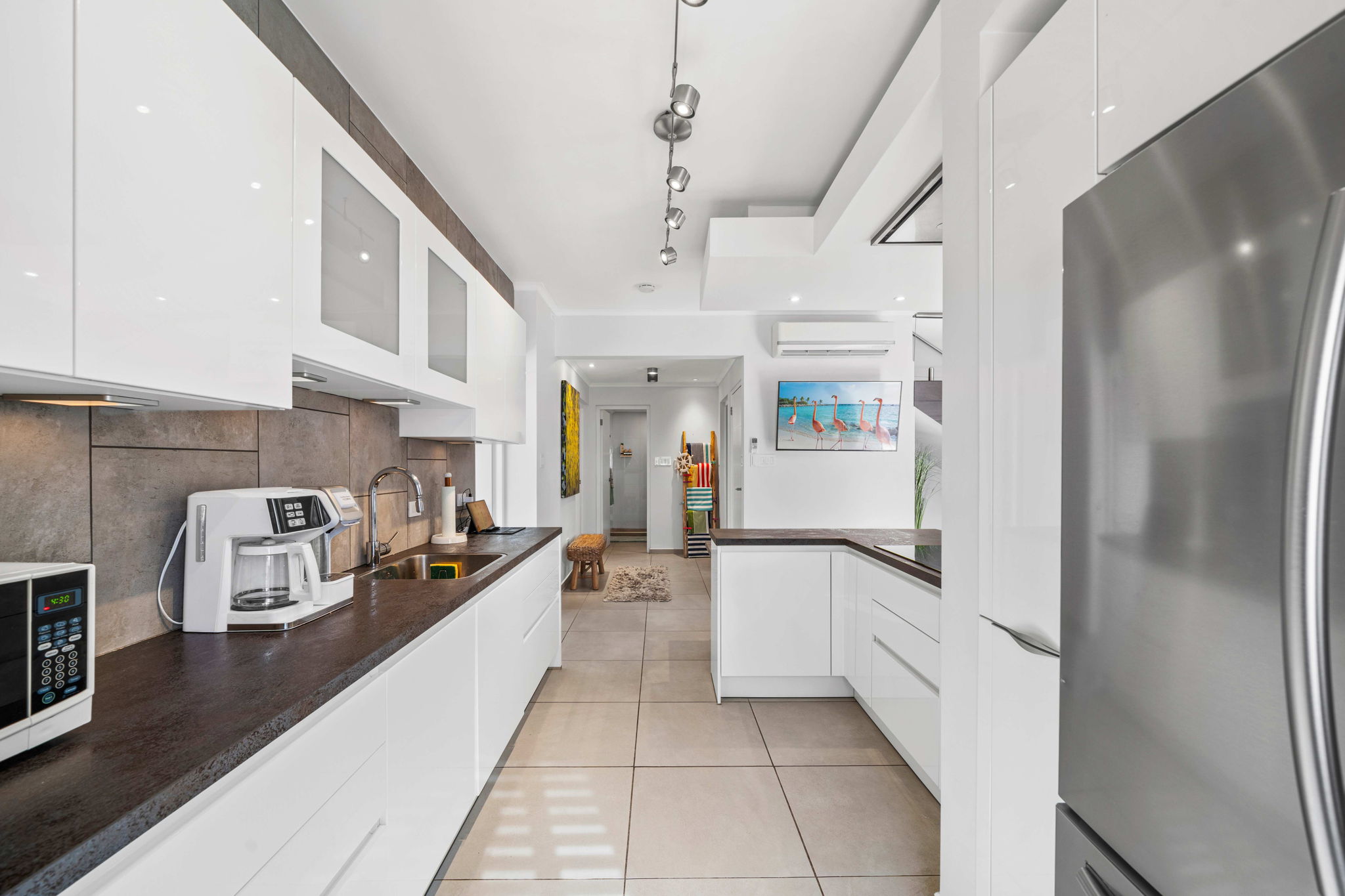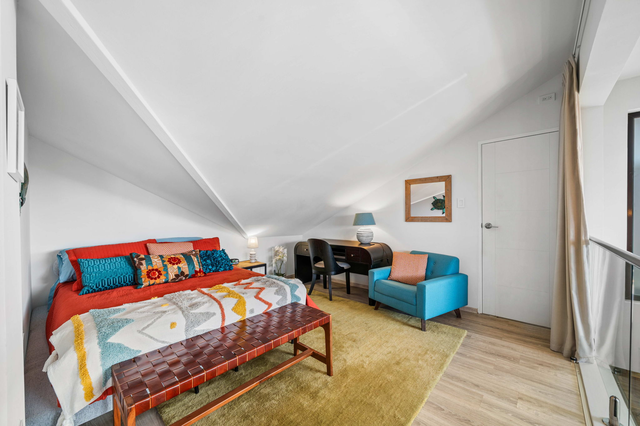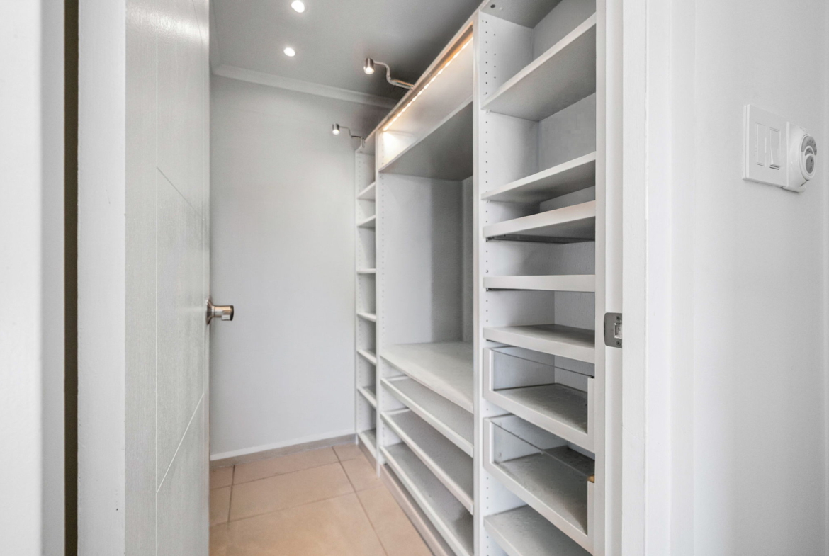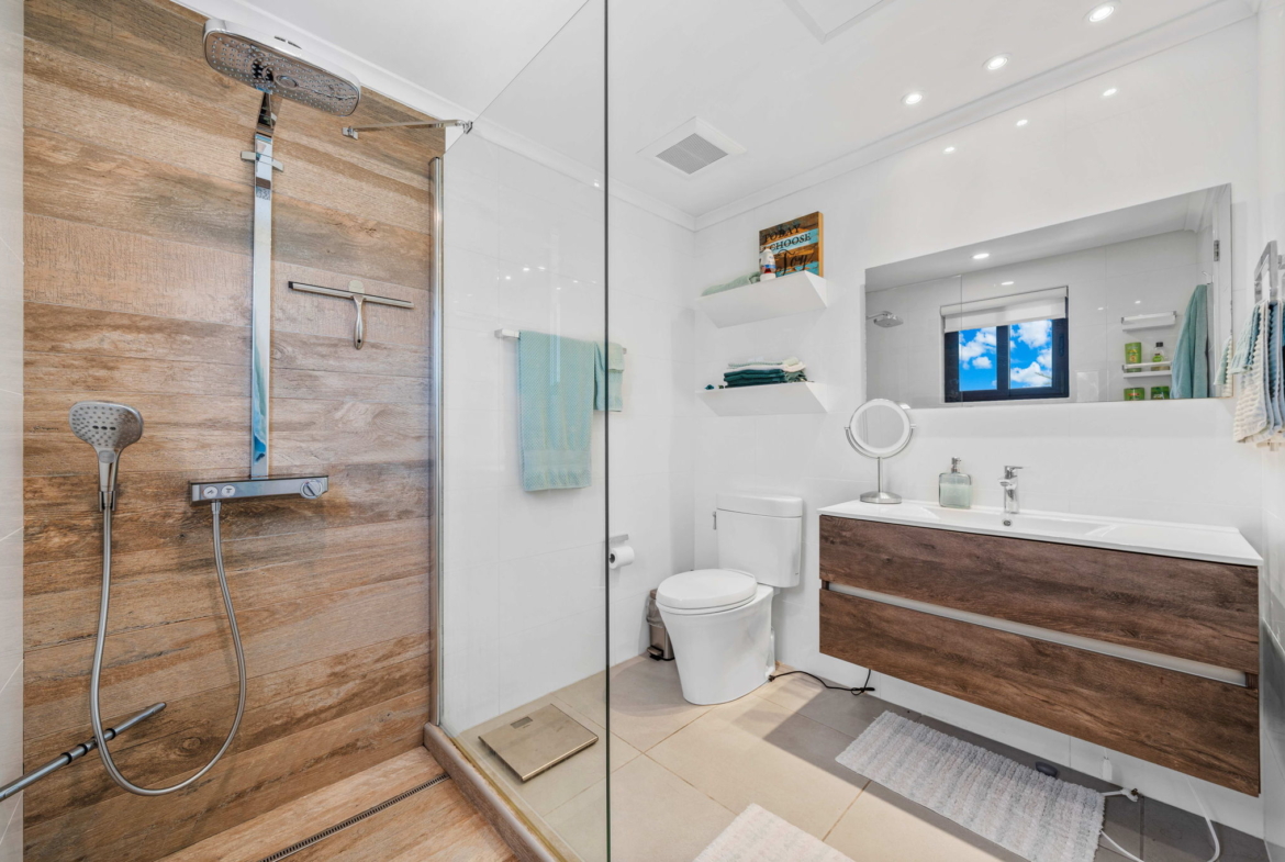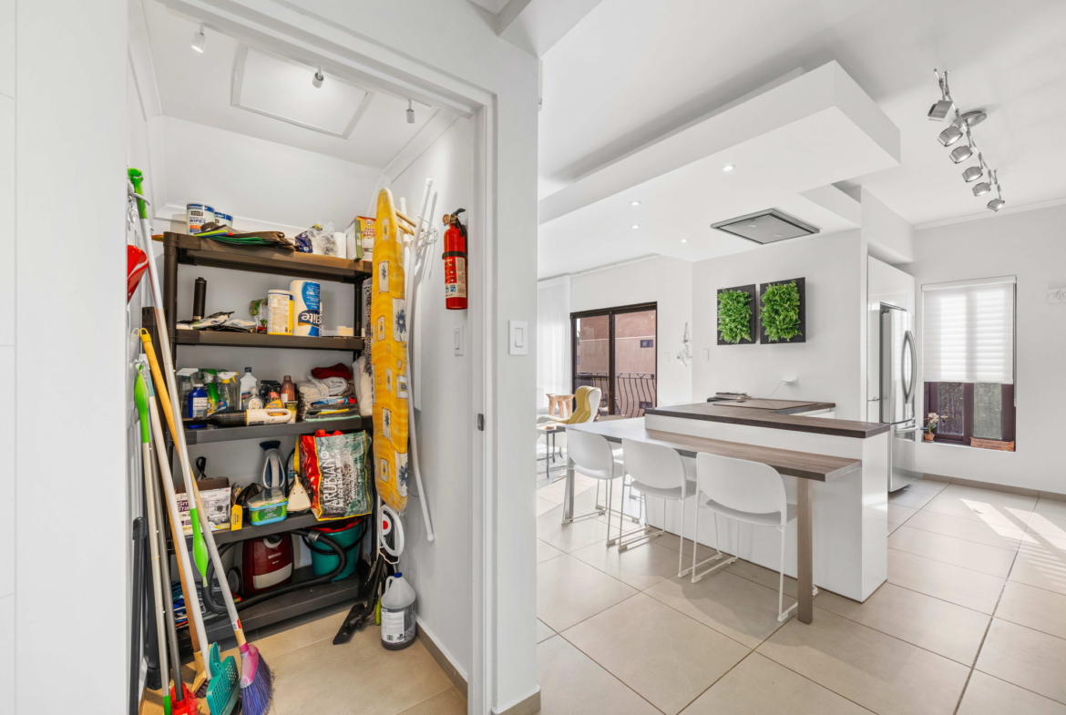 A striking glass-railed staircase leads to the upper level, where a spacious TV lounge and office area provide the perfect setting for relaxation or working from home. This level also offers a thoughtfully designed two-bedroom layout, a convenient storage and laundry area, and access to a covered terrace where you can unwind while enjoying refreshing ocean breezes and beautiful ocean views.