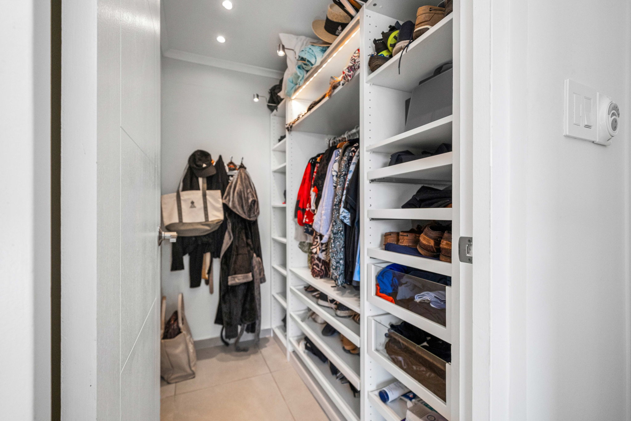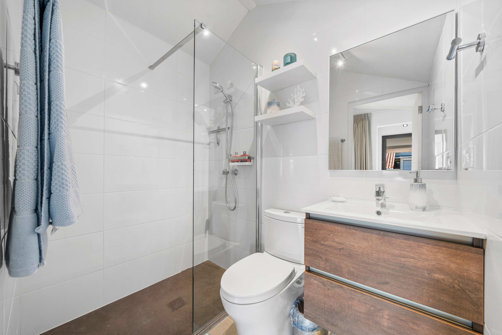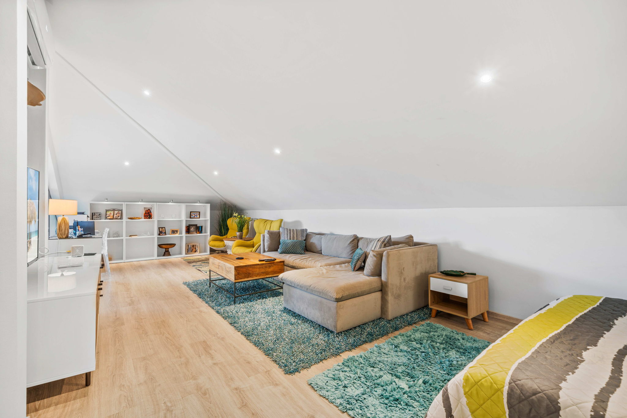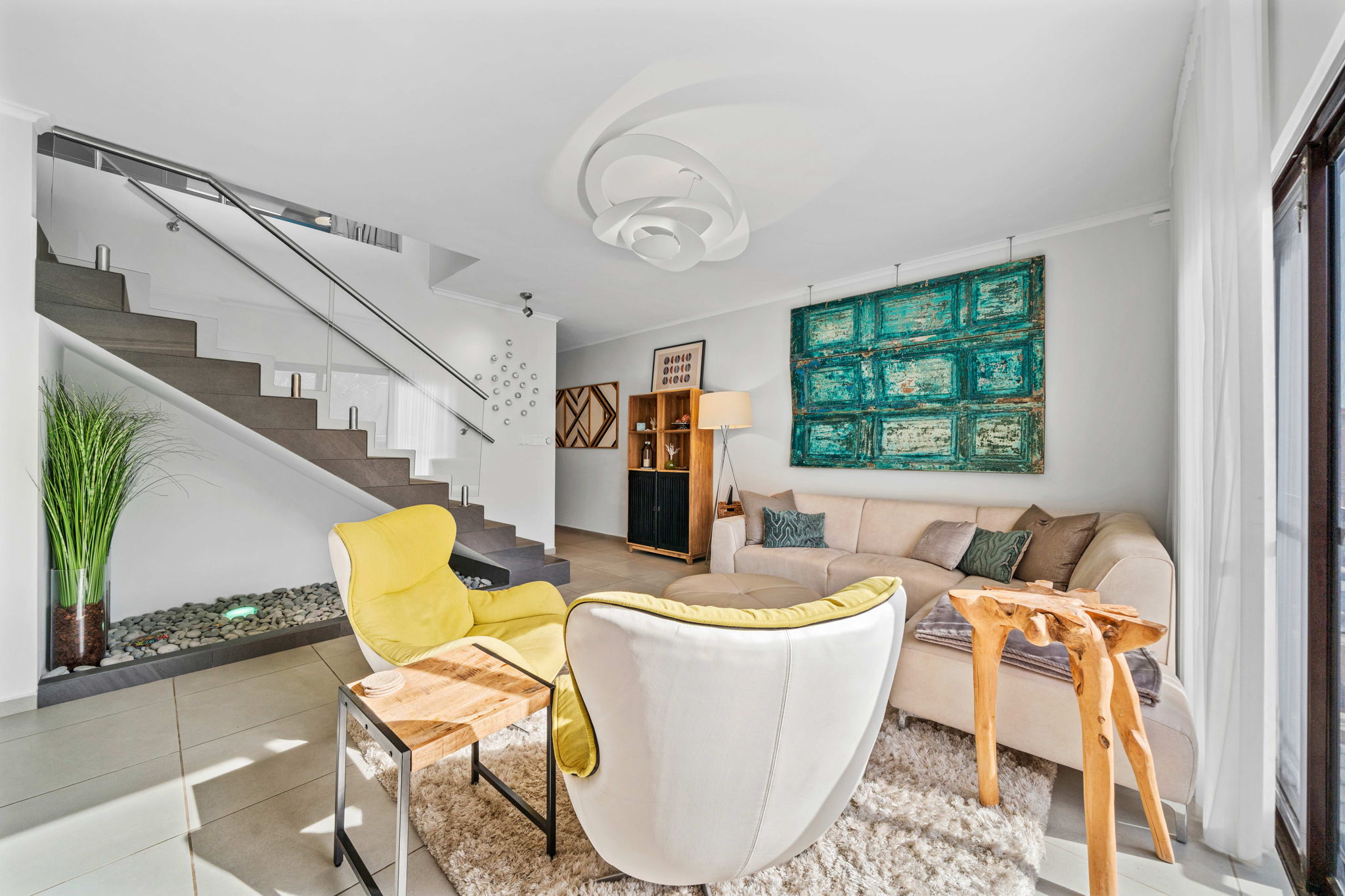 A striking glass-railed staircase leads to the upper level, where a spacious TV lounge and office area provide the perfect setting for relaxation or working from home. This level also offers a thoughtfully designed two-bedroom layout, a convenient storage and laundry area, and access to a covered terrace where you can unwind while enjoying refreshing ocean breezes and beautiful ocean views.
